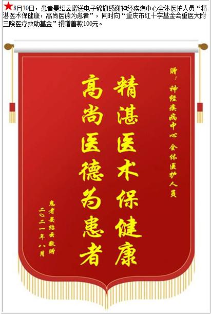 患者晏绍云赠送电子锦旗感谢神经疾病中心全体医护人员,并向医疗救助基金捐赠善款100元-锦旗-患者心声-患者服务-重庆医科大学附属第三医院【官方网站】