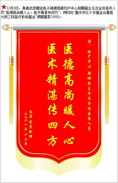 患者武彦赠送电子锦旗感谢妇产中心胡珊副主任及全体医务人员,并向医疗救助基金捐赠善款100元-锦旗-患者心声-患者服务-重庆医科大学附属第三医院【官方网站】
