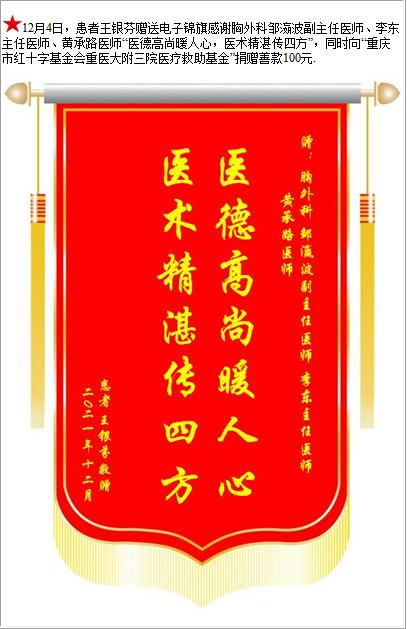 患者王银芬赠送电子锦旗感谢胸外科邹瀛波副主任医师等人,并向医疗救助基金捐赠善款100元-锦旗-患者心声-患者服务-重庆医科大学附属第三医院【官方网站】
