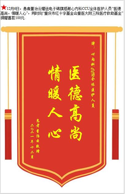 患者董治云赠送电子锦旗感谢心内科CCU全体医护人员,并向医疗救助基金捐赠善款100元-锦旗-患者心声-患者服务-重庆医科大学附属第三医院【官方网站】