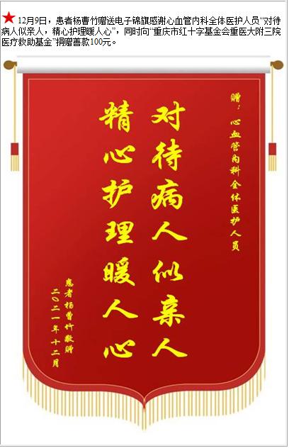 患者杨曹竹赠送电子锦旗感谢心血管内科全体医护人员,并向医疗救助基金捐赠善款100元-锦旗-患者心声-患者服务-重庆医科大学附属第三医院【官方网站】