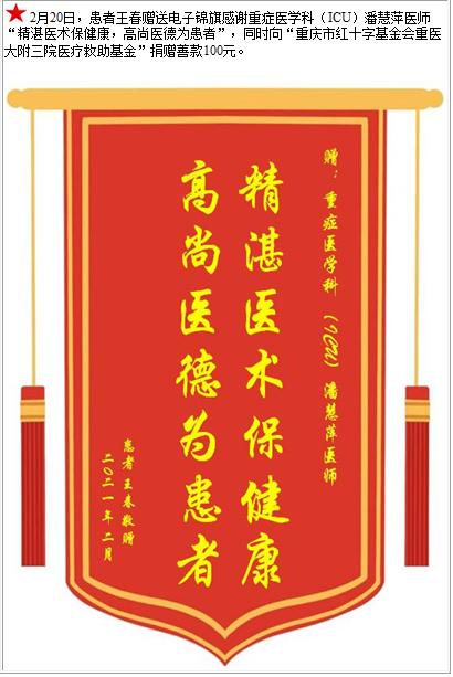 患者王春赠送电子锦旗感谢重症医学科(ICU)潘慧萍医师,并向医疗救助基金捐赠善款100元-锦旗-患者心声-患者服务-重庆医科大学附属第三医院【官方网站】