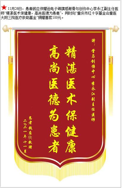 患者钱应俠赠送电子锦旗感谢骨与创伤中心李永江副主任医师,并向医疗救助基金捐赠善款100元-锦旗-患者心声-患者服务-重庆医科大学附属第三医院【官方网站】
