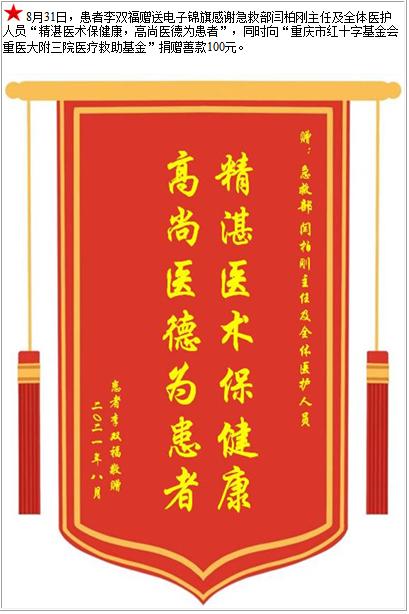 患者李双福赠送电子锦旗感谢急救部闫柏刚主任及全体医护人员,并向医疗救助基金捐赠善款100元-锦旗-患者心声-患者服务-重庆医科大学附属第三医院【官方网站】