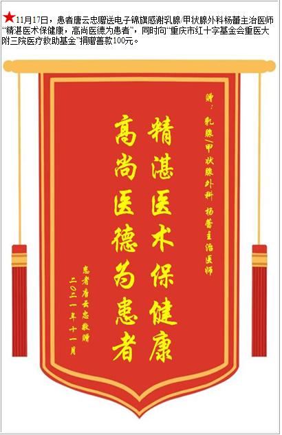 患者唐云忠赠送电子锦旗感谢乳腺/甲状腺外科杨蕾主治医师,并向医疗救助基金捐赠善款100元-锦旗-患者心声-患者服务-重庆医科大学附属第三医院【官方网站】
