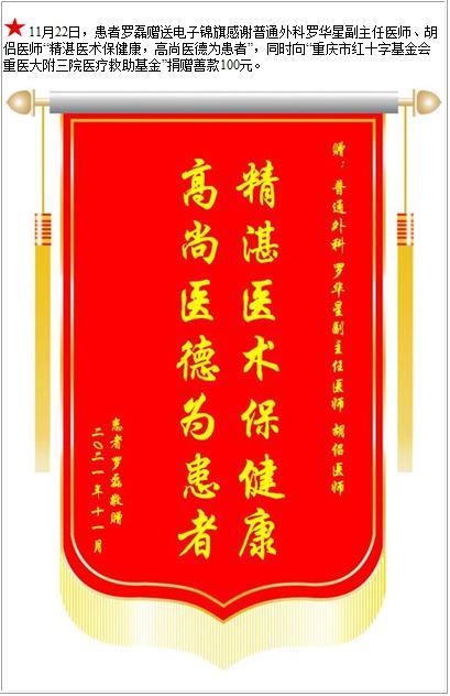 患者罗磊赠送电子锦旗感谢普通外科罗华星副主任医师等人,并向医疗救助基金捐赠善款100元-锦旗-患者心声-患者服务-重庆医科大学附属第三医院【官方网站】