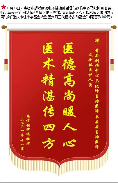 患者张辉述赠送电子锦旗感谢骨与创伤中心马纪坤主治医师等人及全体医护人员,并向医疗救助基金捐赠善款100元-锦旗-患者心声-患者服务-重庆医科大学附属第三医院【官方网站】