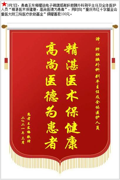 患者王东梅赠送电子锦旗感谢肝胆胰外科别平主任及全体医护人员,并向医疗救助基金捐赠善款100元-锦旗-患者心声-患者服务-重庆医科大学附属第三医院【官方网站】