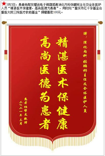 患者杨帮友赠送电子锦旗感谢消化内科张鹏彬主任及全体医护人员,并向医疗救助基金捐赠善款100元-锦旗-患者心声-患者服务-重庆医科大学附属第三医院【官方网站】
