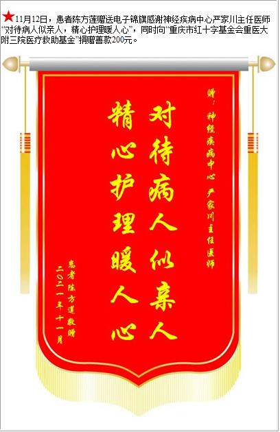 患者陈方莲赠送电子锦旗感谢神经疾病中心严家川主任医师,并向医疗救助基金捐赠善款200元-锦旗-患者心声-患者服务-重庆医科大学附属第三医院【官方网站】