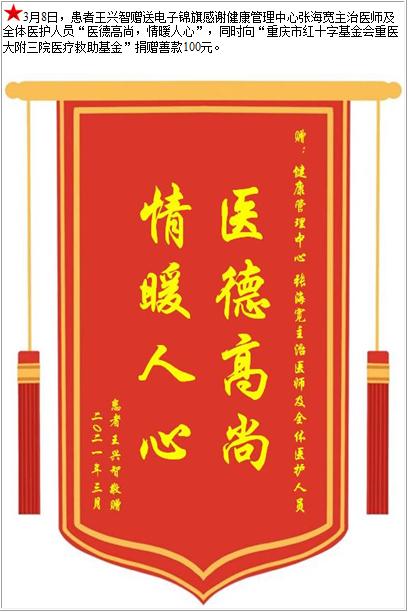 患者王兴智赠送电子锦旗感谢健康管理中心张海宽主治医师及全体医护人员,并向医疗救助基金捐赠善款100元-锦旗-患者心声-患者服务-重庆医科大学附属第三医院【官方网站】