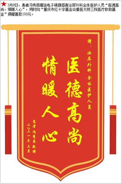 患者冯秀英赠送电子锦旗感谢泌尿外科全体医护人员,并向医疗救助基金捐赠善款100元-锦旗-患者心声-患者服务-重庆医科大学附属第三医院【官方网站】