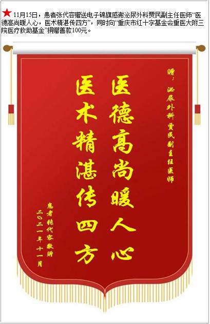 患者张代容赠送电子锦旗感谢泌尿外科贾民副主任医师,并向医疗救助基金捐赠善款100元-锦旗-患者心声-患者服务-重庆医科大学附属第三医院【官方网站】