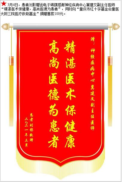 患者刘影赠送电子锦旗感谢神经疾病中心冀建文副主任医师,并向医疗救助基金捐赠善款100元-锦旗-患者心声-患者服务-重庆医科大学附属第三医院【官方网站】