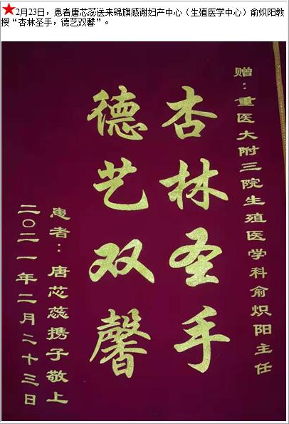 患者唐芯蕊送来锦旗感谢妇产中心(生殖医学中心)俞炽阳教授“杏林圣手,德艺双馨”-锦旗-患者心声-患者服务-重庆医科大学附属第三医院【官方网站】