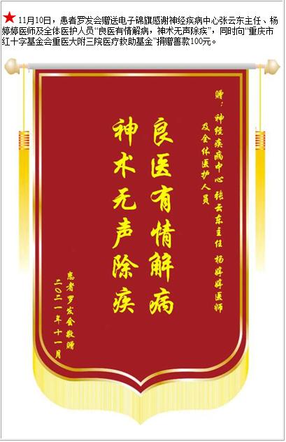 患者罗发会赠送电子锦旗感谢神经疾病中心张云东主任等人及全体医护人员,并向医疗救助基金捐赠善款100元-锦旗-患者心声-患者服务-重庆医科大学附属第三医院【官方网站】