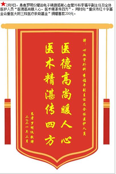 患者罗明仪赠送电子锦旗感谢心血管外科李福平副主任及全体医护人员,并向医疗救助基金捐赠善款200元-锦旗-患者心声-患者服务-重庆医科大学附属第三医院【官方网站】
