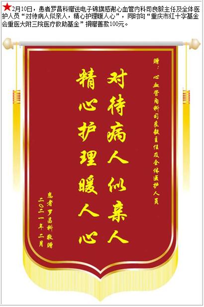 患者罗昌科赠送电子锦旗感谢心血管内科司良毅主任及全体医护人员,并向医疗救助基金捐赠善款100元-锦旗-患者心声-患者服务-重庆医科大学附属第三医院【官方网站】