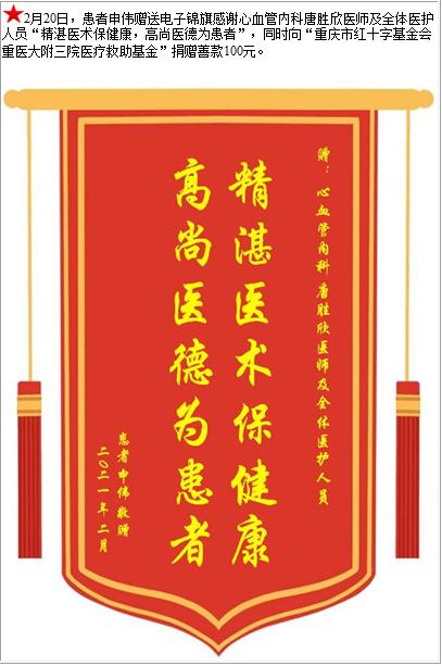患者申伟赠送电子锦旗感谢心血管内科唐胜欣医师及全体医护人员,并向医疗救助基金捐赠善款100元-锦旗-患者心声-患者服务-重庆医科大学附属第三医院【官方网站】