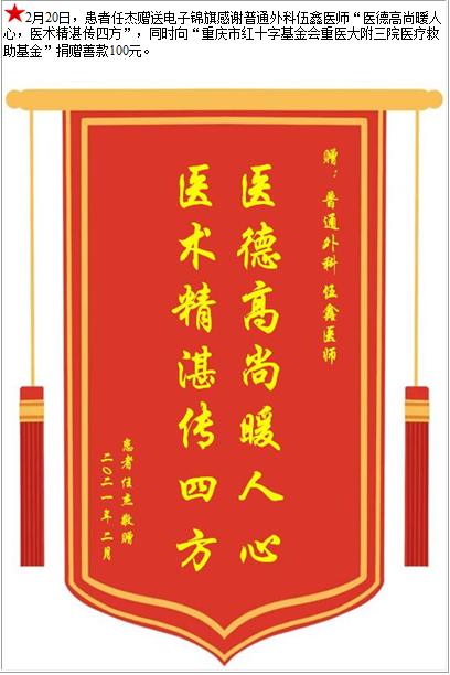 患者任杰赠送电子锦旗感谢普通外科伍鑫医师,并向医疗救助基金捐赠善款100元-锦旗-患者心声-患者服务-重庆医科大学附属第三医院【官方网站】