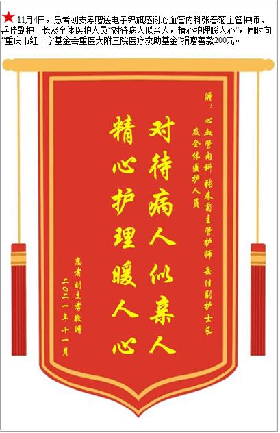 患者刘支孝赠送电子锦旗感谢心血管内科张春菊主管护师等人及全体医护人员,并向医疗救助基金捐赠善款200元-锦旗-患者心声-患者服务-重庆医科大学附属第三医院【官方网站】
