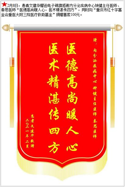 患者文建华赠送电子锦旗感谢内分泌疾病中心钟健主任医师等人,并向医疗救助基金捐赠善款100元-锦旗-患者心声-患者服务-重庆医科大学附属第三医院【官方网站】