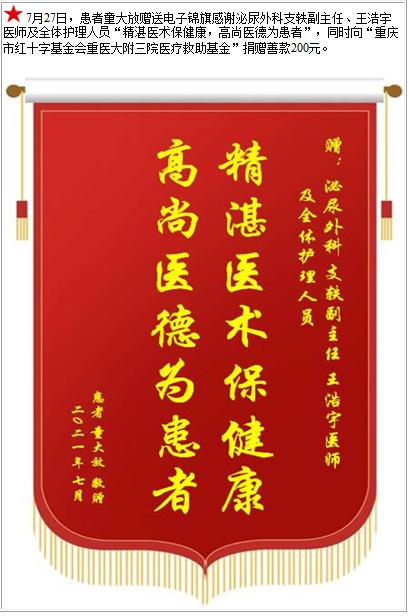 患者童大放赠送电子锦旗感谢泌尿外科支轶副主任等人及全体护理人员,并向医疗救助基金捐赠善款200元-锦旗-患者心声-患者服务-重庆医科大学附属第三医院【官方网站】