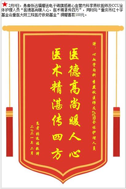 患者张远福赠送电子锦旗感谢心血管内科李燕秋医师及CCU全体护理人员,并向医疗救助基金捐赠善款100元-锦旗-患者心声-患者服务-重庆医科大学附属第三医院【官方网站】