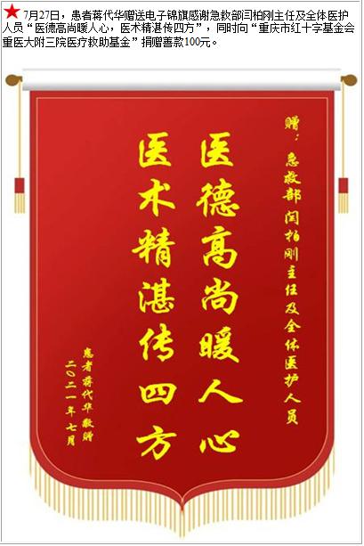 患者蒋代华赠送电子锦旗感谢急救部闫柏刚主任及全体医护人员,并向医疗救助基金捐赠善款100元-锦旗-患者心声-患者服务-重庆医科大学附属第三医院【官方网站】