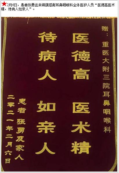 患者张勇送来锦旗感谢耳鼻咽喉科全体医护人员“医德高医术精,待病人如亲人”-锦旗-患者心声-患者服务-重庆医科大学附属第三医院【官方网站】