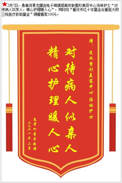 患者何景龙赠送电子锦旗感谢皮肤整形美容中心汤林护士,并向医疗救助基金捐赠善款100元-锦旗-患者心声-患者服务-重庆医科大学附属第三医院【官方网站】