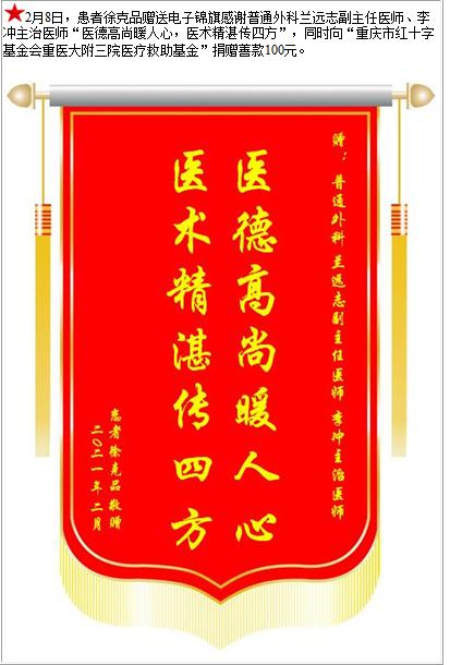 患者徐克品赠送电子锦旗感谢普通外科兰远志副主任医师等人,并向医疗救助基金捐赠善款100元-锦旗-患者心声-患者服务-重庆医科大学附属第三医院【官方网站】
