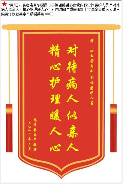 患者梁春华赠送电子锦旗感谢心血管内科全体医护人员,并向医疗救助基金捐赠善款100元-锦旗-患者心声-患者服务-重庆医科大学附属第三医院【官方网站】