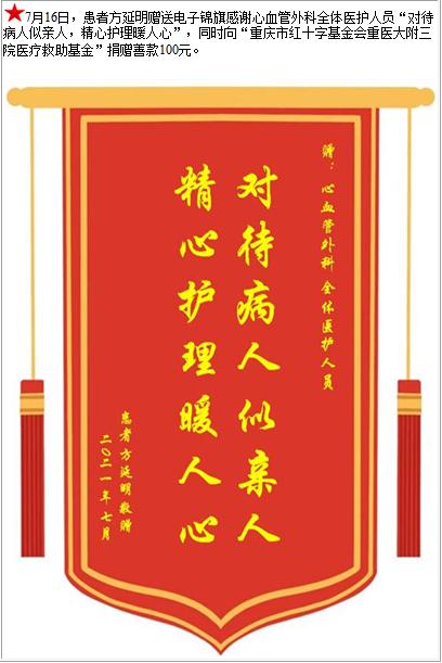 患者方延明赠送电子锦旗感谢心血管外科全体医护人员,并向医疗救助基金捐赠善款100元-锦旗-患者心声-患者服务-重庆医科大学附属第三医院【官方网站】