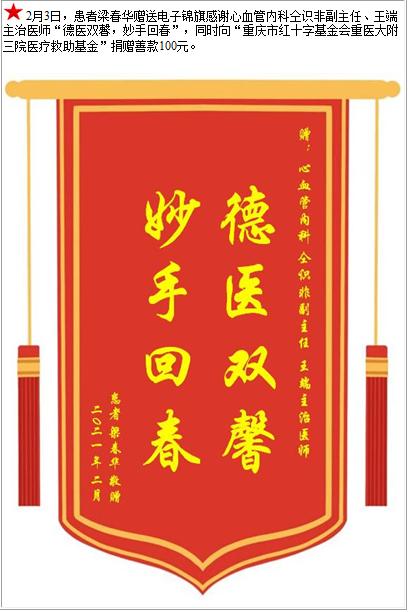 患者梁春华赠送电子锦旗感谢心血管内科仝识非副主任等人,并向医疗救助基金捐赠善款100元-锦旗-患者心声-患者服务-重庆医科大学附属第三医院【官方网站】