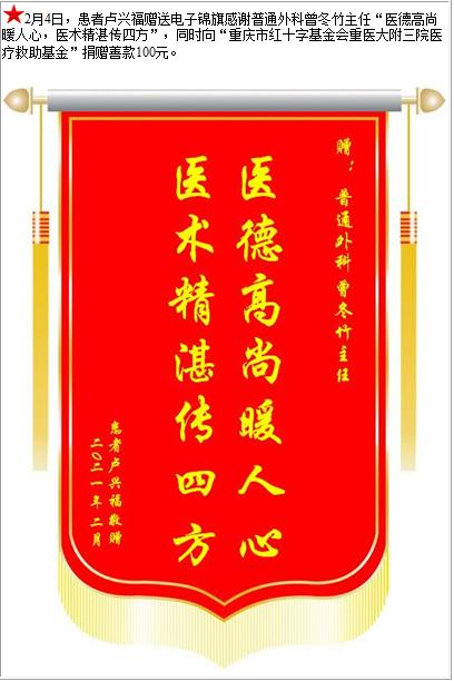 患者卢兴福赠送电子锦旗感谢普通外科曾冬竹主任,并向医疗救助基金捐赠善款100元-锦旗-患者心声-患者服务-重庆医科大学附属第三医院【官方网站】