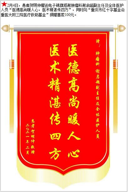 患者贺明仲赠送电子锦旗感谢肿瘤科谢启超副主任及全体医护人员,并向医疗救助基金捐赠善款100元-锦旗-患者心声-患者服务-重庆医科大学附属第三医院【官方网站】