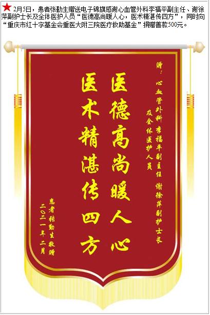 患者张勤生赠送电子锦旗感谢心血管外科李福平副主任等人及全体医护人员,并向医疗救助基金捐赠善款500元-锦旗-患者心声-患者服务-重庆医科大学附属第三医院【官方网站】