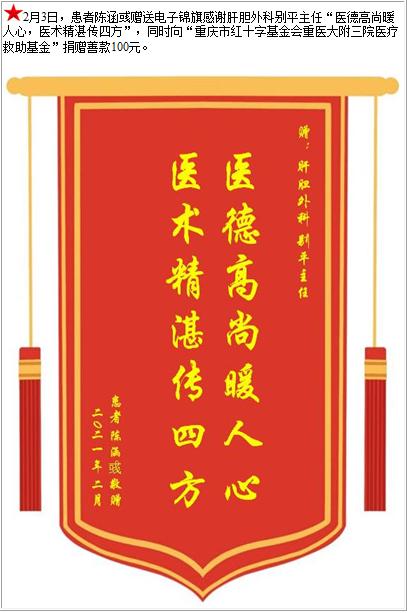 患者陈涵彧赠送电子锦旗感谢肝胆外科别平主任,并向医疗救助基金捐赠善款100元-锦旗-患者心声-患者服务-重庆医科大学附属第三医院【官方网站】