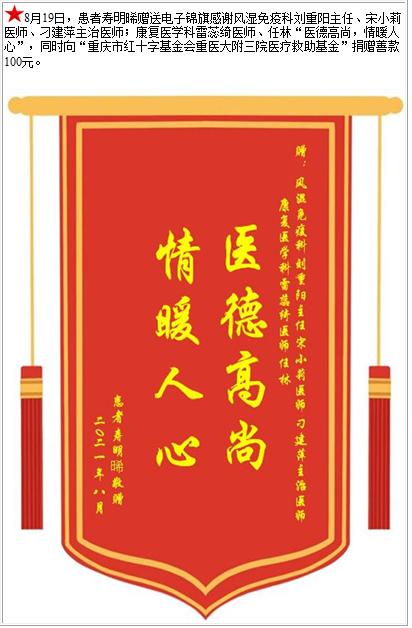 患者寿明晞赠送电子锦旗感谢风湿免疫科刘重阳主任等人;康复医学科雷蕊绮医师等人,并向医疗救助基金捐赠善款100元-锦旗-患者心声-患者服务-重庆医科大学附属第三医院【官方网站】