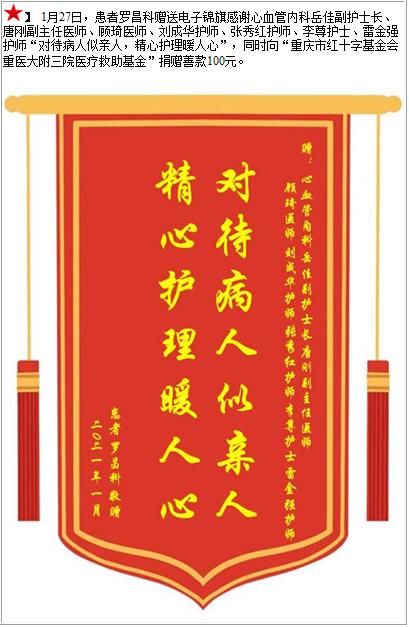 患者罗昌科赠送电子锦旗感谢心血管内科岳佳副护士长等人,并向医疗救助基金捐赠善款100元-锦旗-患者心声-患者服务-重庆医科大学附属第三医院【官方网站】