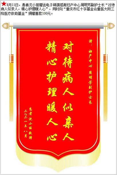 患者沈小丽赠送电子锦旗感谢妇产中心周明芳副护士长,并向医疗救助基金捐赠善款100元-锦旗-患者心声-患者服务-重庆医科大学附属第三医院【官方网站】