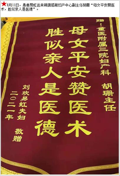 患者易虹送来锦旗感谢妇产中心副主任胡珊“母女平安赞医术,胜似亲人是医德”-锦旗-患者心声-患者服务-重庆医科大学附属第三医院【官方网站】
