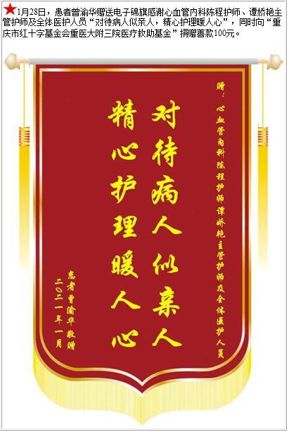 患者曾渝华赠送电子锦旗感谢心血管内科陈程护师等人及全体医护人员,并向医疗救助基金捐赠善款100元-锦旗-患者心声-患者服务-重庆医科大学附属第三医院【官方网站】