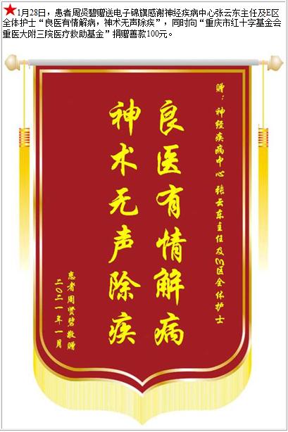 患者周贤碧赠送电子锦旗感谢神经疾病中心张云东主任及E区全体护士,并向医疗救助基金捐赠善款100元-锦旗-患者心声-患者服务-重庆医科大学附属第三医院【官方网站】