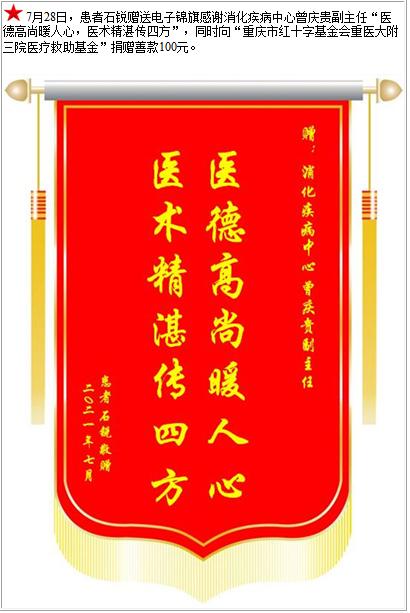 患者石锐赠送电子锦旗感谢消化疾病中心曾庆贵副主任,并向医疗救助基金捐赠善款100元-锦旗-患者心声-患者服务-重庆医科大学附属第三医院【官方网站】