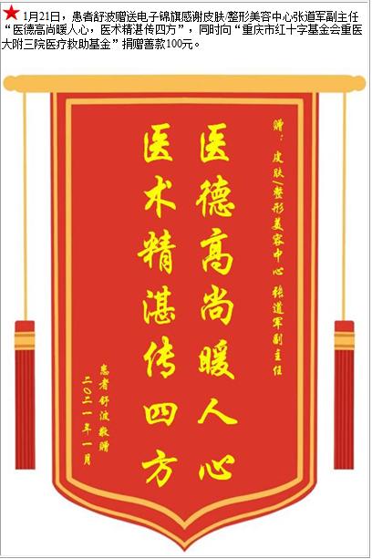 患者舒波赠送电子锦旗感谢皮肤/整形美容中心张道军副主任,并向医疗救助基金捐赠善款100元-锦旗-患者心声-患者服务-重庆医科大学附属第三医院【官方网站】