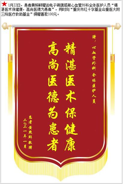 患者黄照鲜赠送电子锦旗感谢心血管外科全体医护人员,并向医疗救助基金捐赠善款100元-锦旗-患者心声-患者服务-重庆医科大学附属第三医院【官方网站】