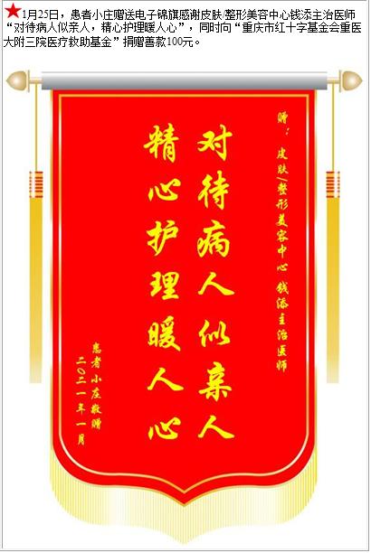 患者小庄赠送电子锦旗感谢皮肤/整形美容中心钱添主治医师,并向医疗救助基金捐赠善款100元-锦旗-患者心声-患者服务-重庆医科大学附属第三医院【官方网站】