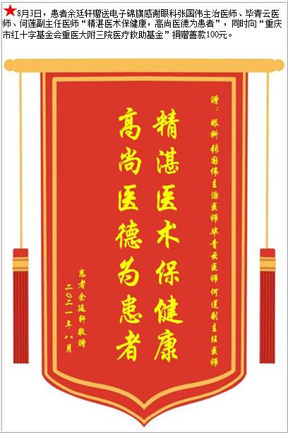 患者余廷轩赠送电子锦旗感谢眼科张国伟主治医师等人,并向医疗救助基金捐赠善款100元-锦旗-患者心声-患者服务-重庆医科大学附属第三医院【官方网站】